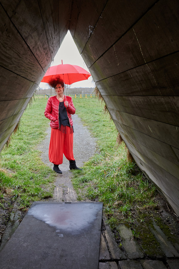 | En zo zet de fotograaf je even op een stoel, op de rijweg midden in de Flevopolder |